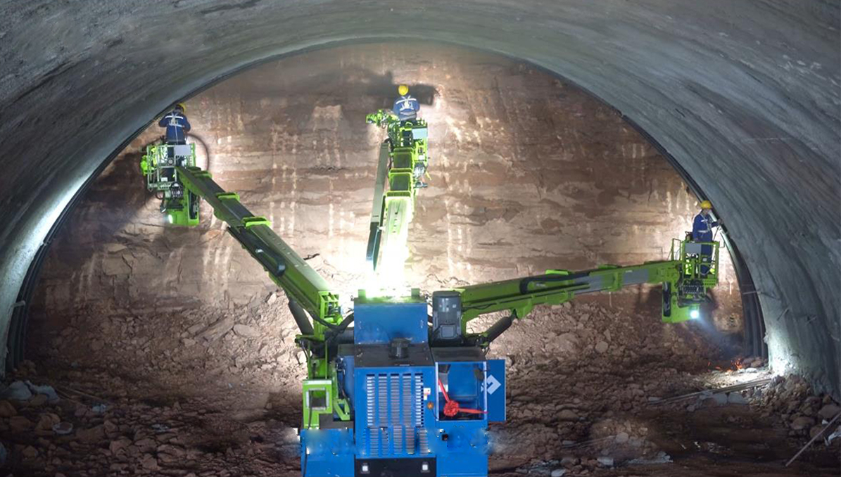 将预制好的钢拱架通过装载机转运至掌子面,拱架安装台车随后进场准备施工,通过遥控操作展开臂架,测量人员测量放点,根据测量情况,可操控设备臂架上的破碎锤,进行欠挖和排危处理,遥控操作中间臂架将拱顶举升至安装位置,左右两侧臂架分别夹取两侧钢拱架,并举升至左右安装位置,使用电动扳手紧固螺栓,拱架连接完成,随后焊接网片及连接筋,采用多榀预制拱架方式,在洞外将钢拱架加工预制成多榀状态,减少洞内作业时间,提高施工安全性。作业人员只需连接第一榀拱架的连接筋和网片,其劳动强度大大降低,并且操作人员的工作位置在初支面,大大降低作业安全风险。
