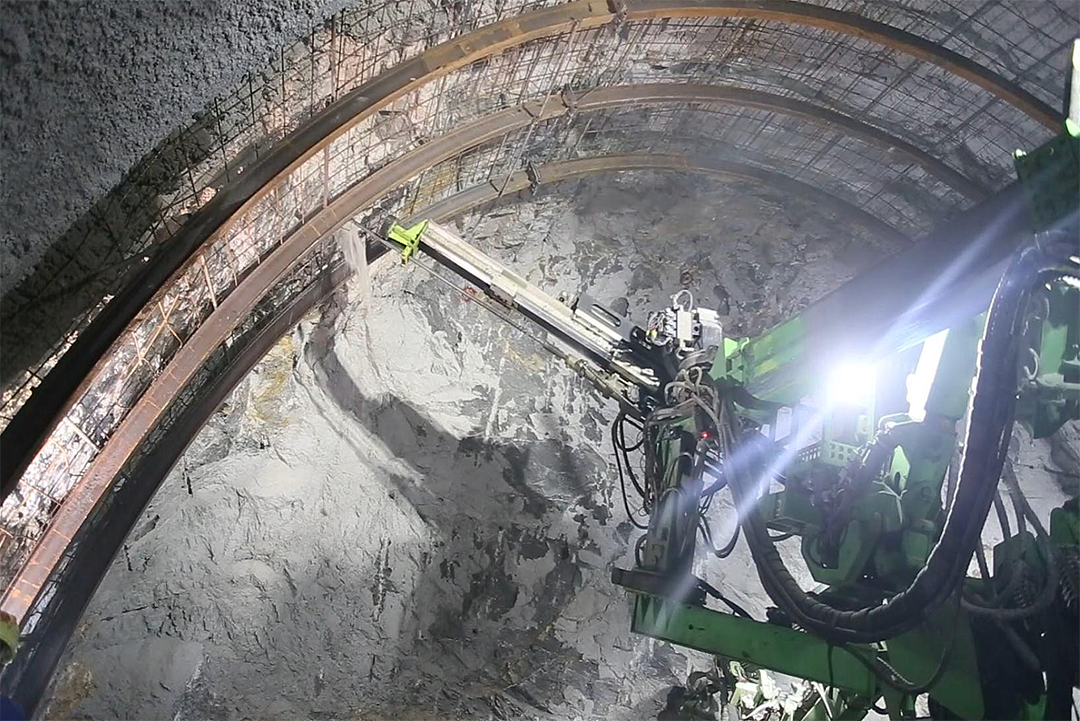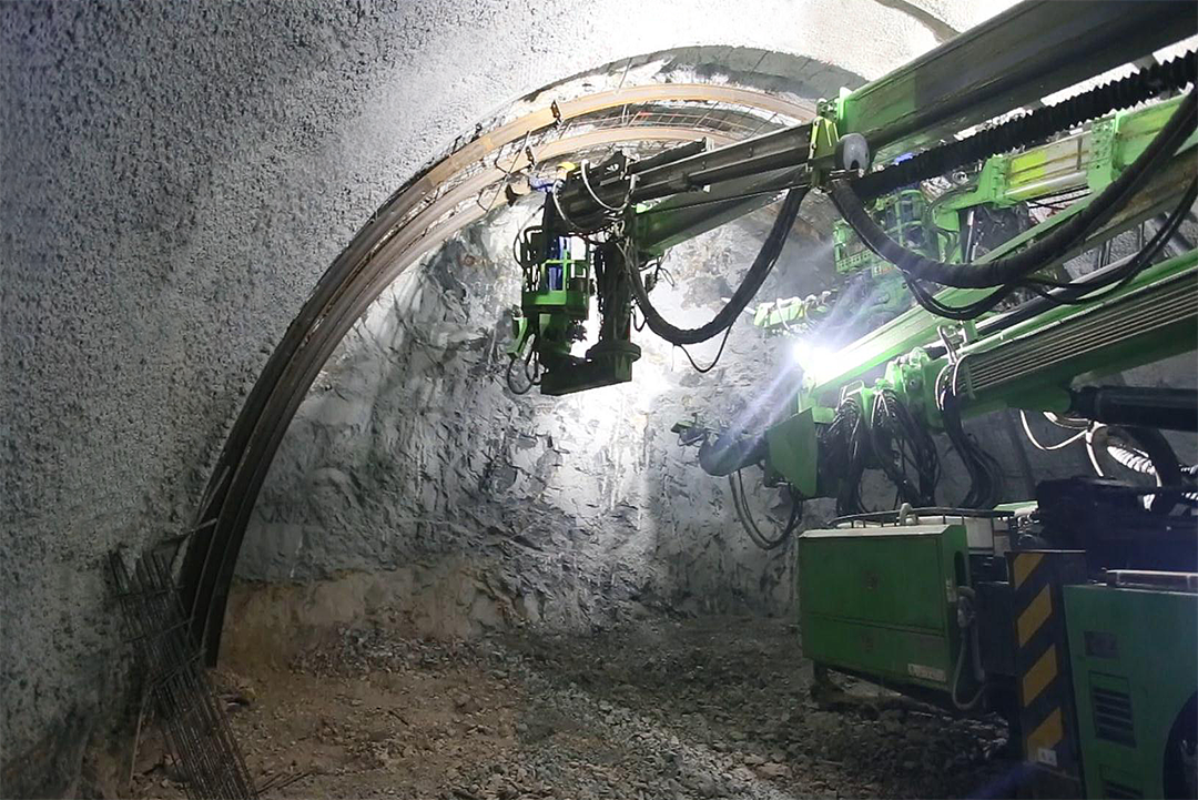 将预制好的钢拱架以及所需材料转运到掌子面,智能拱锚一体化台车随后进洞准备施工,设备达到指定位置后,撑起支腿,中间臂架将中间拱架举升到所需安装的位置,左右拱架臂分别讲预制拱架抓起,两端拱架到位后,在已初支好的安全位置连接拱架,保证了施工人员的安全,三臂协助将拼装好拱架调整定位并固定,钢拱架安装到位后,将剩余网片连接筋焊接好。