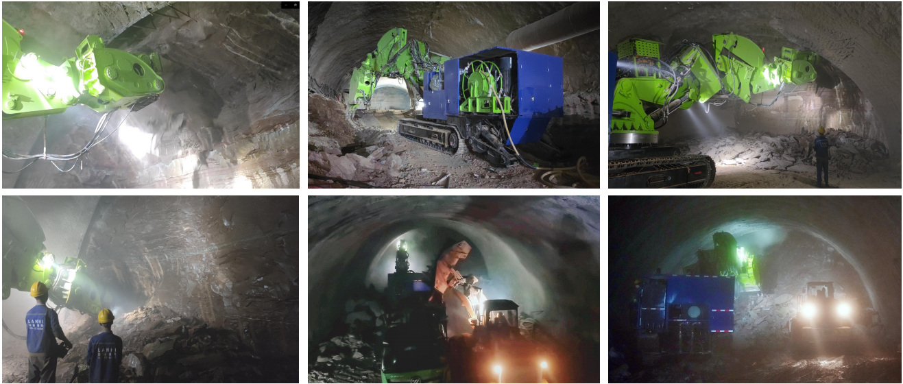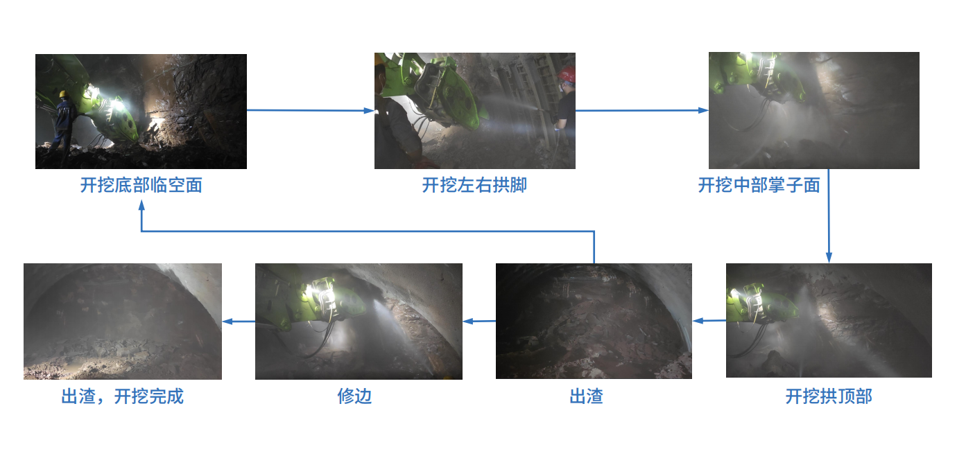 4、开挖拱顶,平行出渣:采用平行出渣方式(开挖作业与出渣同时进行,大幅缩短施工时间,提高施工效率)。