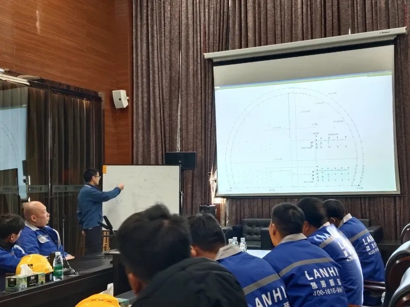 蓝海专业讲师向学员们深入浅出地讲解拱架设备与凿岩设备产品知识:针对施工工艺,详细剖析了不同地质条件下的施工流程与要点,结合实际案例,让学员们清晰把握工艺精髓;设备原理讲解中,运用直观的模型与示意图,阐释设备的机械构造、液压知识及电气控制原理,使学员们深入理解设备运行的内在逻辑。
