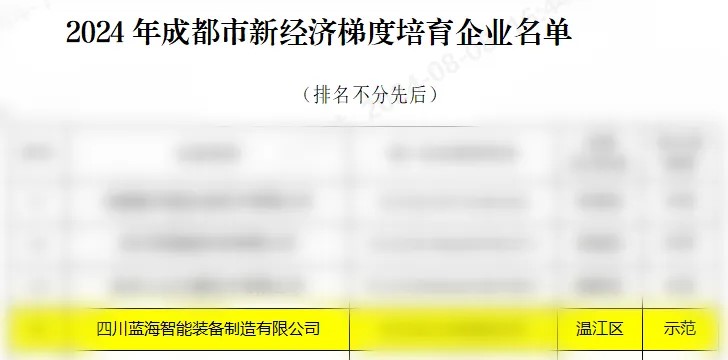 根据《成都市温江区雏鹰企业和瞪羚企业认定办法(2024版)》的相关要求,瞪羚企业是指具有较强创新能力、具有较高发展潜力、具有一定规模且呈现爆发式增长的创新型企业。本次蓝海智装成功获评“2024年温江区瞪羚企业”,不仅是对公司创新精神和发展潜力的双重认可,更是对蓝海未来高质量发展前景的有力证明。